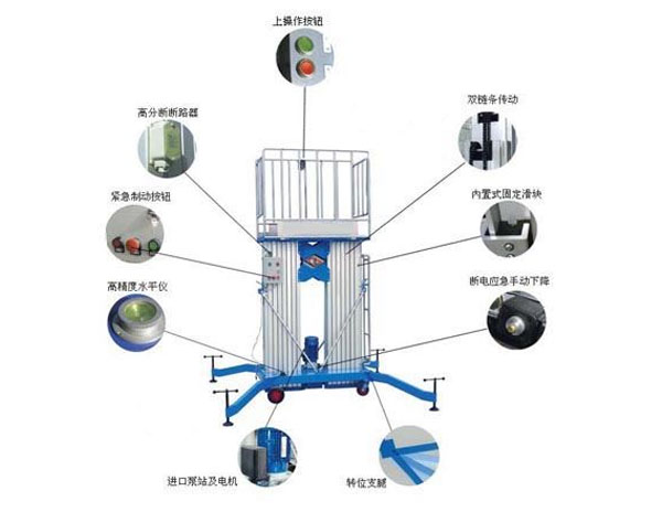雙柱鋁合金升降機:升降動力分為220V、 380V,或電瓶動力源,特殊環(huán)境也可采用防爆泵站及防爆電器。升高4——10米,載重100-150公斤。主體采用高強度優(yōu)質(zhì)鋁合金材料,具有造型美觀、體積小、重量輕、升降平穩(wěn)、安全可靠等優(yōu)點。廣泛用于工廠、賓館、餐廳、車站、影劇院、展覽館等場所,是保養(yǎng)機具、油漆裝修、調(diào)換燈具、電器、清潔保養(yǎng)等用途的最佳安全伴侶。